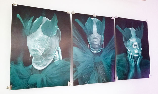 In a future or inter-dimensional triptych titled ‘Ufaman’ (Namafu backwards), Amutse imagines the evolution of eyes. Creating a shimmer-skinned, feather-eyed turquoise version of herself, the artist considers what we perceive when what we are used to seeing is no longer accessible to us.
