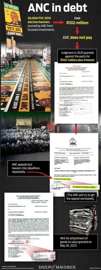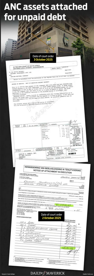 Rapport first reported that the ANC had its bank accounts frozen and R140,000 of goods carted away from its Luthuli House headquarters last week. The graphic shows the detail.
