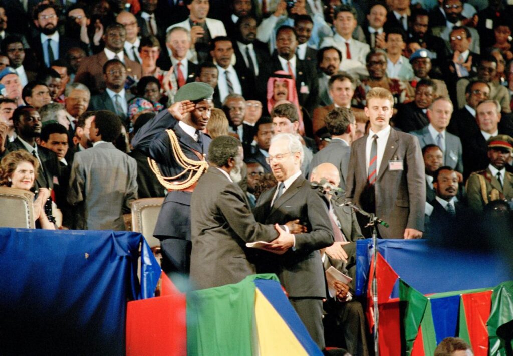 We shouted “down, down, down”, when at midnight of 21 March 1990 the South African flag was finally lowered. It was a jubilant, euphoric mood. Nelson Mandela was with us. Released only a few weeks before, Madiba received thunderous applause…