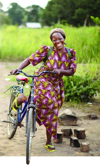Angelique is constantly on the move on her bicycle on the chaotic and dusty roads. She goes out to give literacy lessons in Lingala, the main local language, and to teach baking, cooking and sewing to make clothes.