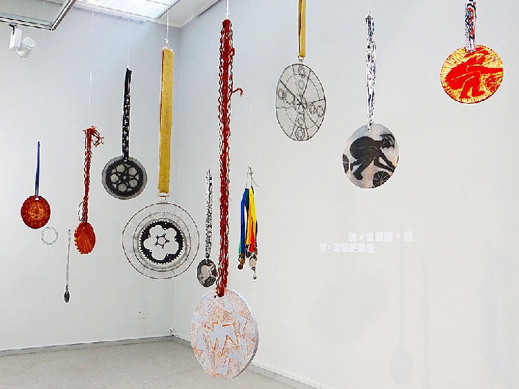 There isn’t a single bicycle in Trudi Dicks’ ‘Come Cycle with Me’. No streamlined mountain bikes, no bulky BMXes. Instead, the single track vehicle exists as allusion. As wheels hung from the ceiling, circular artworks strung like medals along the back wall and car spring sculptures mimicking arduous cycling routes.