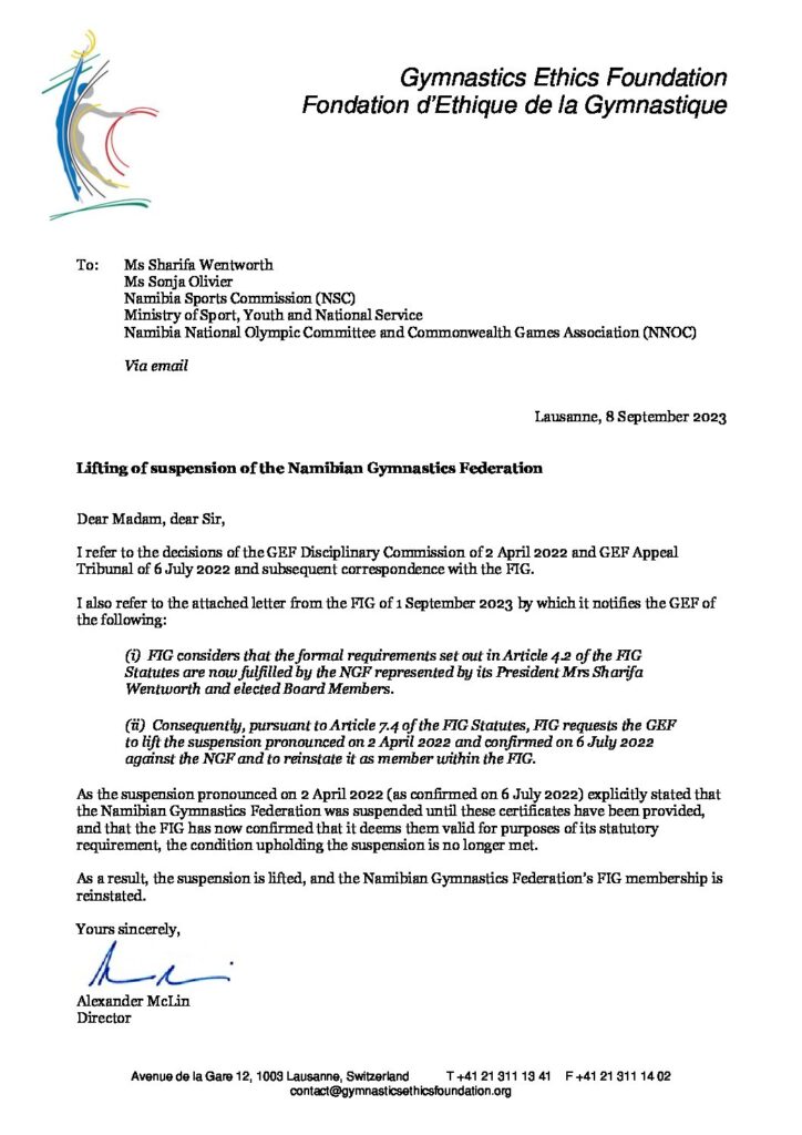 “As a result, the suspension is lifted, and the Namibian Gymnastics Federation’s FIG membership is reinstated,” GEF director Alexander McLin told Wentworth, Olivier and other stakeholders on Friday.