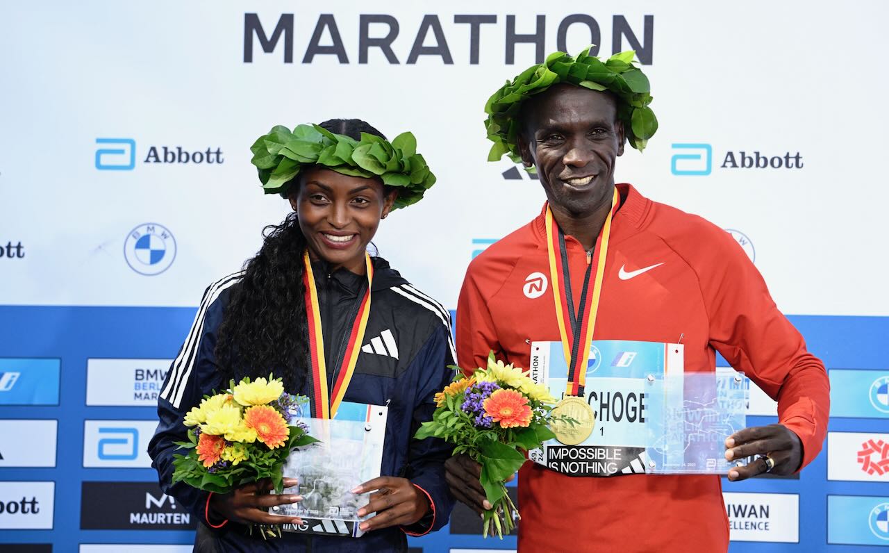 Ethiopian Tigist Assefa smashed the women’s marathon world record by more than two minutes in Berlin on Sunday as Kenyan Eliud Kipchoge won the men’s race for a record fifth time.