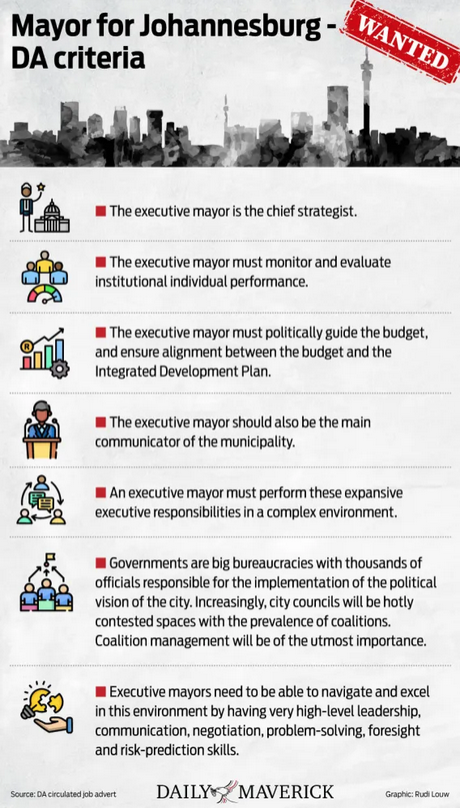 A senior official who spoke off the record said Johannesburg is “so far gone” that the party felt it needed a high-velocity candidate, as the DA has a strong chance of winning the city. An ANC-led coalition holds a slim majority in the city with the EFF, Patriotic Alliance and Action SA.