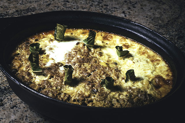 Initially, Cape cooks made the dish over an open fire and with precooked meat. They also replaced the pine kernels with almonds, which were much more readily available. True to the original dish, the dish arrived at the table in the vessel it was cooked in, the bobotijkeetel.