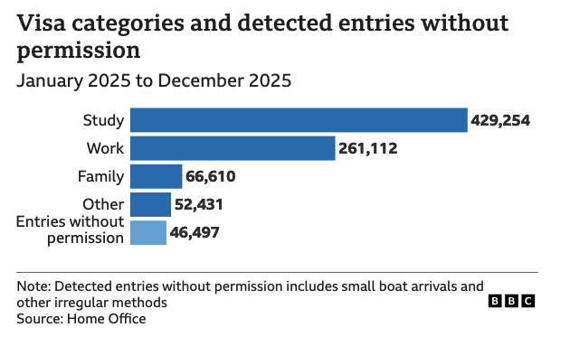 In its release, the government said asylum claims from people who had originally travelled to the UK legally – to do something like studying – had more than tripled between 2021 and 2025.