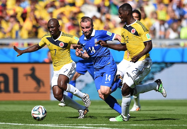 Colombia may have thought they were safe but the Greeks gave them a warning that all was not done as Vasilios Torosidis found the unmarked Theofanis Gekas yards out from the goal, but the 34-year-old’s header beat Ospina only to cannon back off the bar.