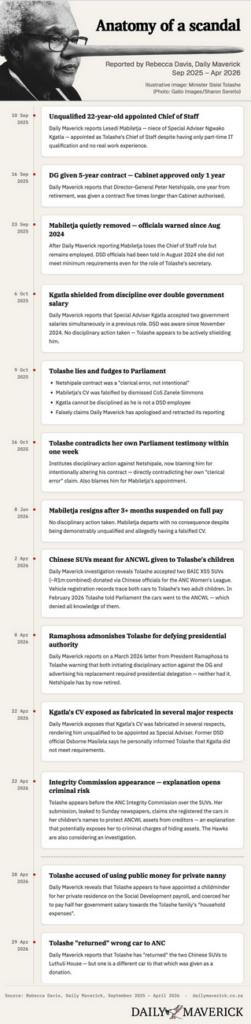 Questions sent to Tolashe by Daily Maverick through the Department of Social Development were redirected to ANCWL spokesperson Boitumelo Moiloa, who did not respond. Kanyisa Tolashe and ANC Secretary-General Fikile Mbalula also did not respond to our requests for comment.