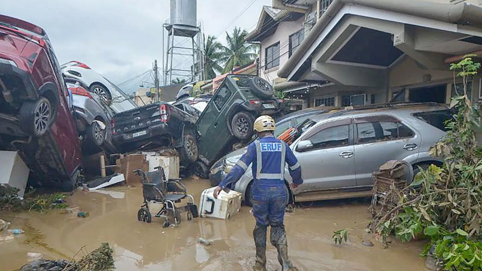 Damage to residential areas on Cebu was extensive, with many small buildings swept away and a thick carpet of mud left by the retreating floodwaters. Rescue teams took to boats to free people who were trapped inside their houses.