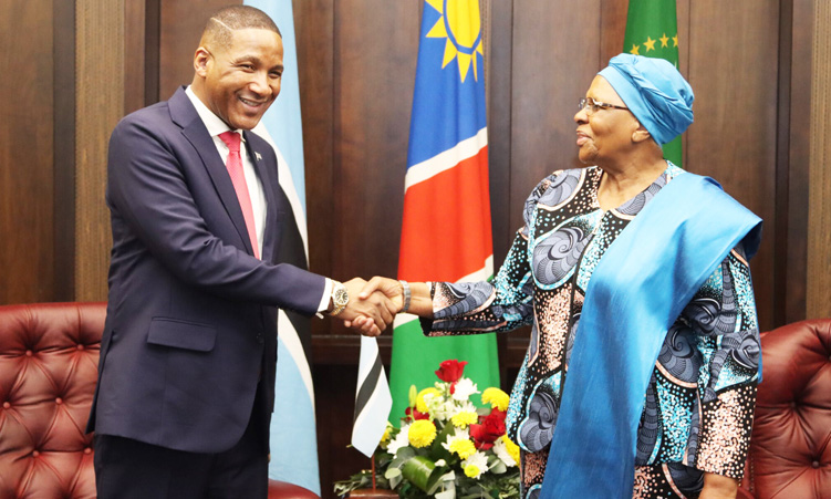 Presidente Netumbo Nandi-Ndaitwah naPresidente Duma Boko waBotswana okwa li va ninga eenghundafana kEumbo lEpangelo Etitano sha landula etalelepo lopailonga lefiku limwe moNamibia.