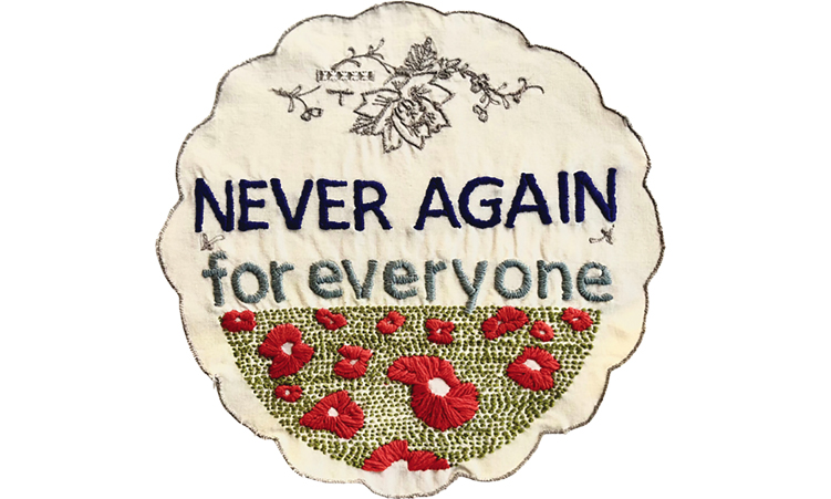 As facetious as doilies that declare “Gay. Uninstalling” or give being queer a one-star rating, Rogge also cheerfully refutes the archetype of the miserable ‘childless cat lady’ and is most solemn in a protest of the contemporary repetition of genocidal history.