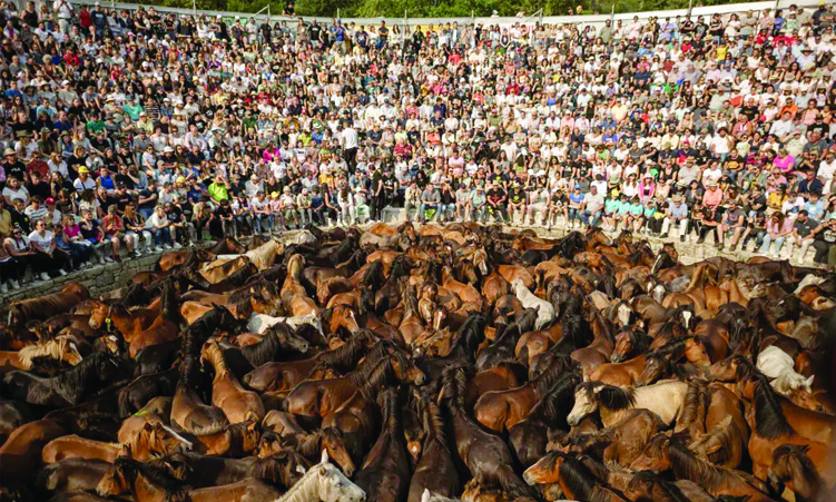 People attend the traditional Rapa Das Bestas in the village of Sabucedo, Spain. Wild horses are captured in the hills and then car- ried to a farmyard to brand them and cut their horsehair. Sev- eral thousand people attended to observe young people over- coming horses with- out using ropes or sticks. Photo: EPA