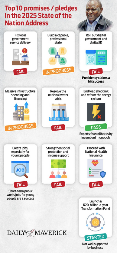 But almost everything else – from water to municipalities to jobs – tells a story of stalled delivery and unrealised promises. South Africa’s (SA’s) president has promised reform, professionalism and renewal. Our assessment of 10 State of the Nation Address (Sona) pledges from 2025 finds progress in energy and infrastructure – and repeated failure in local government, water, jobs and health.