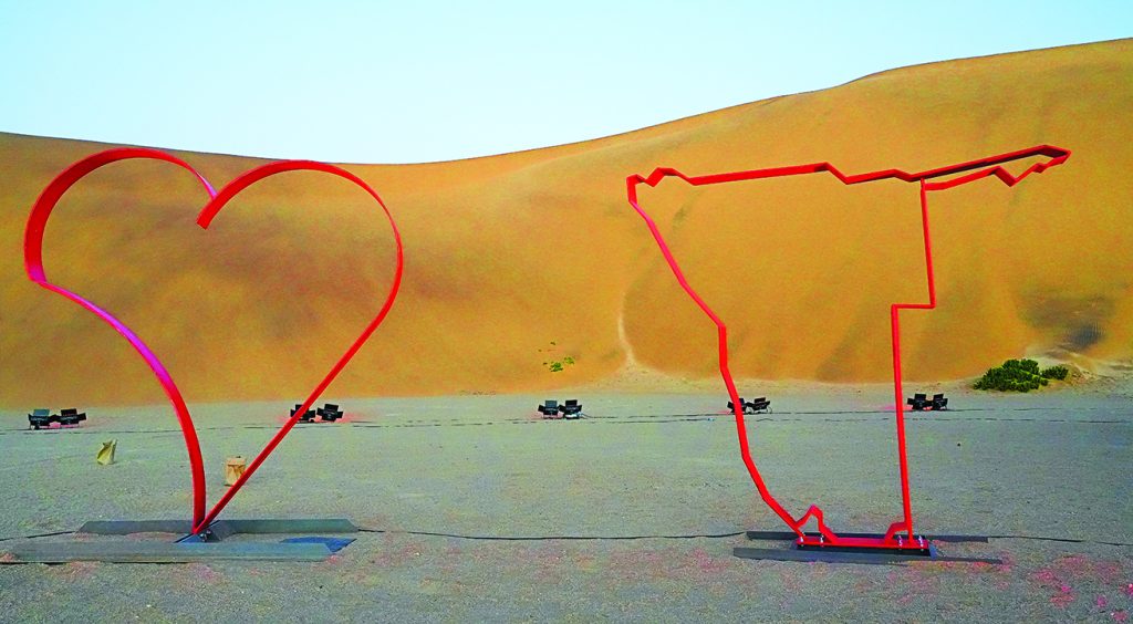 Three buses slowly make their way across the sandy landscape as the sun sinks behind the Swakopmund dunes. They arrive at a scene with two frames: one of a heart, the other the outline of Namibia. Warm lights decorate each emblem, creating a radiant atmosphere for what appears to be an evening of fun and unity.