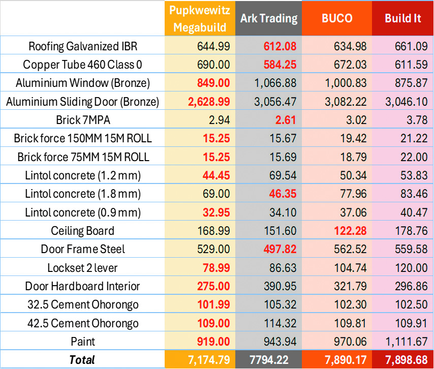 Higher-ticket disparities: Buco and Build It recorded higher prices, particularly on aluminium doors and windows, and paint, key drivers behind their overall higher totals.