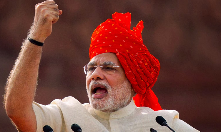 By the time India’s prime minister finally stepped on to the stage, bowing deeply while immaculately dressed in a white kurta and peach waistcoat and with a neatly trimmed beard, the chants had reached a deafening pitch: “Modi, Modi, Modi.”