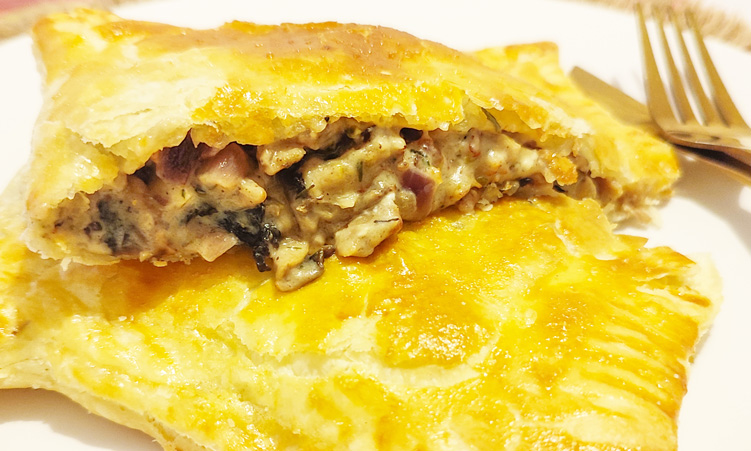 - In the meantime, place a sheet of baking paper in a grill or ovenproof tray to prevent sticking. Lay the store-bought puff pastry sheet over the baking paper. Cut evenly into four equal pieces. Carefully transfer the chicken-and-mushroom filling to half of each of the prepared pastry, spreading it out evenly and making sure not to scoop in too much. Fill each with a quarter of the filling or less. Cover the filling with the other half of the pastry piece, and use a fork dipped in flour or milk to seal the edges. Brush with beaten egg.