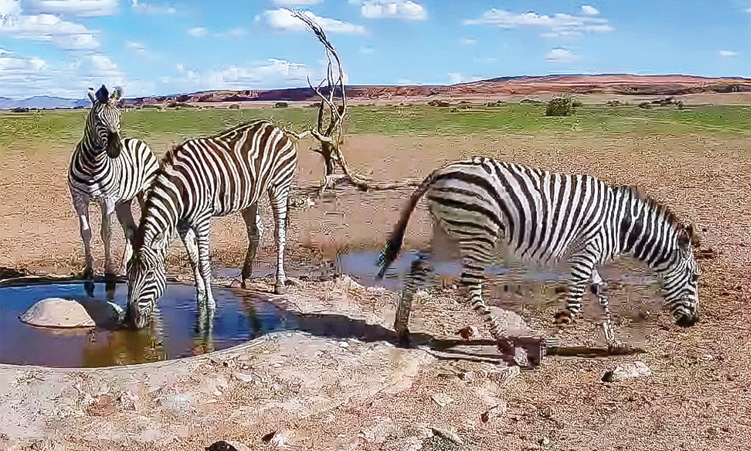 Gondwana’s popular webcam (‘NamibiaCam’ on YouTube), positioned at a waterhole at Namib Desert Lodge, livestreams the animal visitors that come to slake their thirst and these often include the mountain zebras.