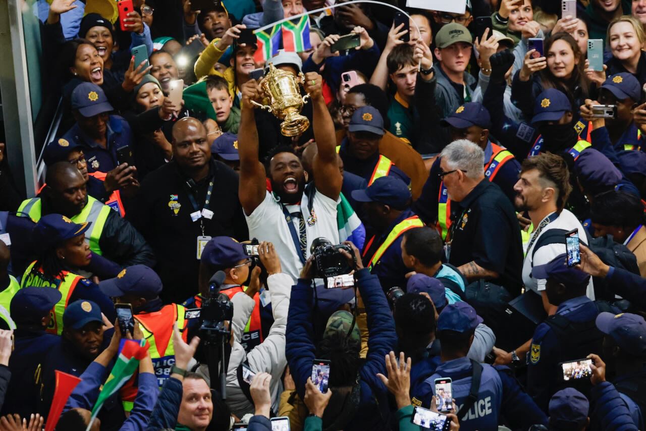 Supporters cheered in unison as captain Siya Kolisi emerged into the public area, waved at the crowd while holding the Webb Ellis Cup, and took selfies with jubilant supporters.