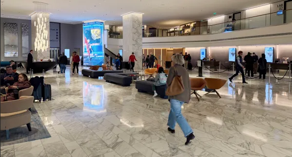 A somewhat soulless-looking skyscraper, it is buttressed by a grey shopping centre. But the hotel’s most distinctive aspect, one which you grasp already blocks away from its base, is its height: it towers above every other structure in the vicinity, stretching 34 stories into the sky.