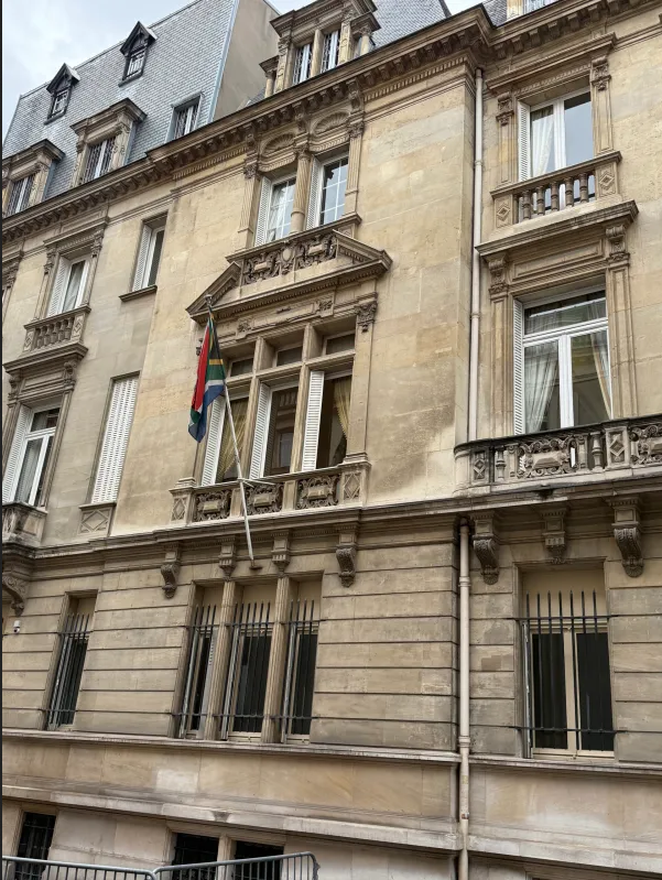 While I am skulking outside the South African ambassador’s official residence, trying not to look like someone who may have just robbed the Louvre of the Napoleonic crown jewels, a blonde woman walks past and suddenly pauses, clearly struck by the South African flag, and stops to take a photograph.