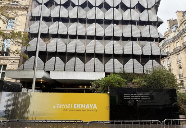 “Welcome/Bienvenue EKHAYA, South Africa’s home away from home”, reads an installation outside it, probably erected in honour of Deputy President Paul Mashatile’s recent state visit.