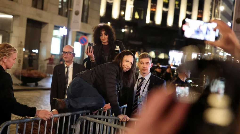 Earlier on Wednesday, her daughter, Ana Corina Sosa, accepted the Nobel Peace Prize on her mother’s behalf.