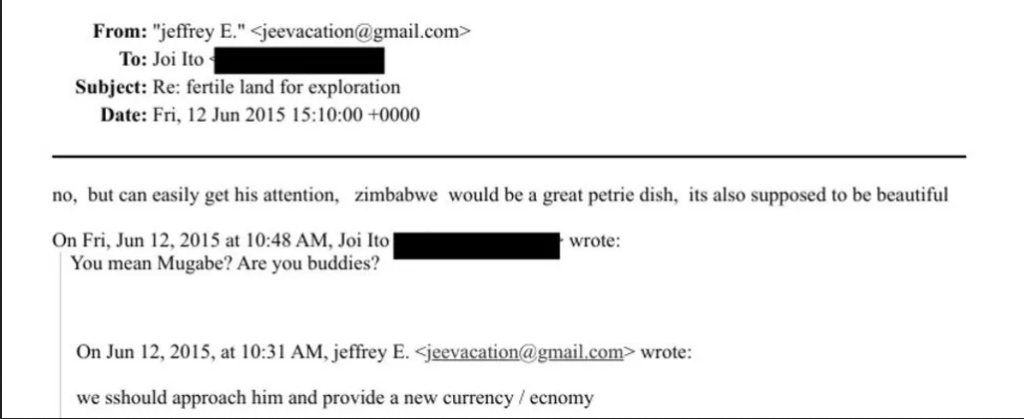 In response to the email about providing Zimbabwe with a new currency, with the subject “fertile land for exploration”, Ito, whose email address is redacted, asked if Epstein was friends with Mugabe, to which he replied: “No, but can easily get his attention, zimbabwe would be a great petrie dish, its also supposed to be beautiful.”